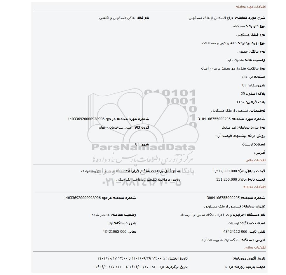 شرح مورد معامله: حراج قسمتی از ملک مسکونینام کالا: اماکن مسکونی و اقامتی