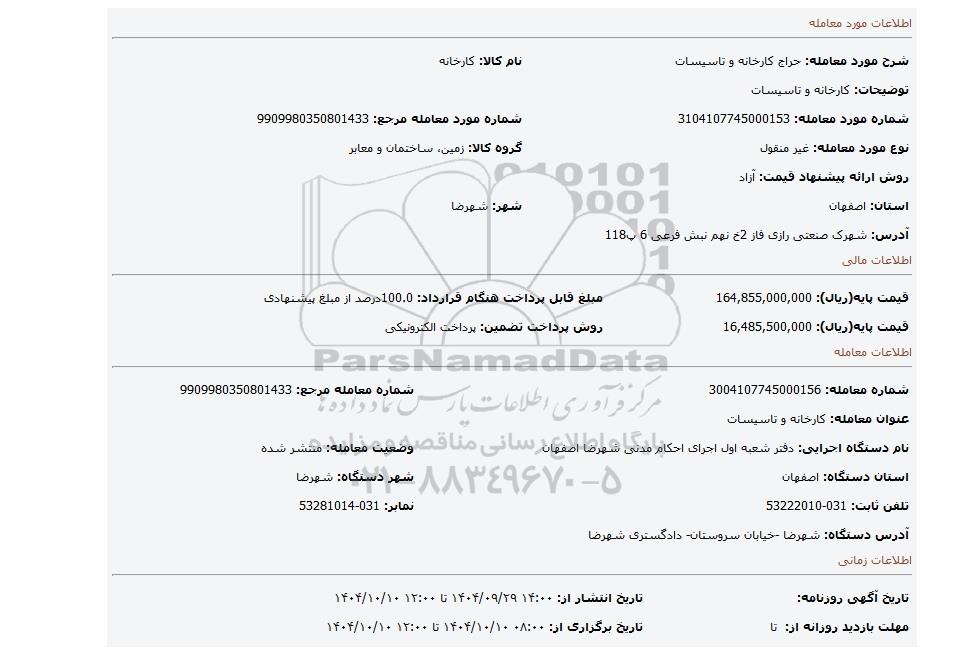 مزایده عمومی مزایده کارخانه و تاسیسات برگزار میگردد. از کلیه افراد متخصص و شرکت‌های واجد شرایط دعوت به عمل می‌آید تا در این مزایده با کد خبرگزاری پارس نماد : 10023580 شرکت نمایند تاریخ شروع مزایده : 1404/09/29 مهلت شرکت در مزایده: تا پایان روز 1404/10/10 مکان برگزاری اموال واگذاری استان‌های مزایدات استان اصفهان و دسته‌بندی‌های مربوط به این حراجی تجهیزات کارخانه ها و ماشین آلات صنعتی, املاک و زمین میباشد.