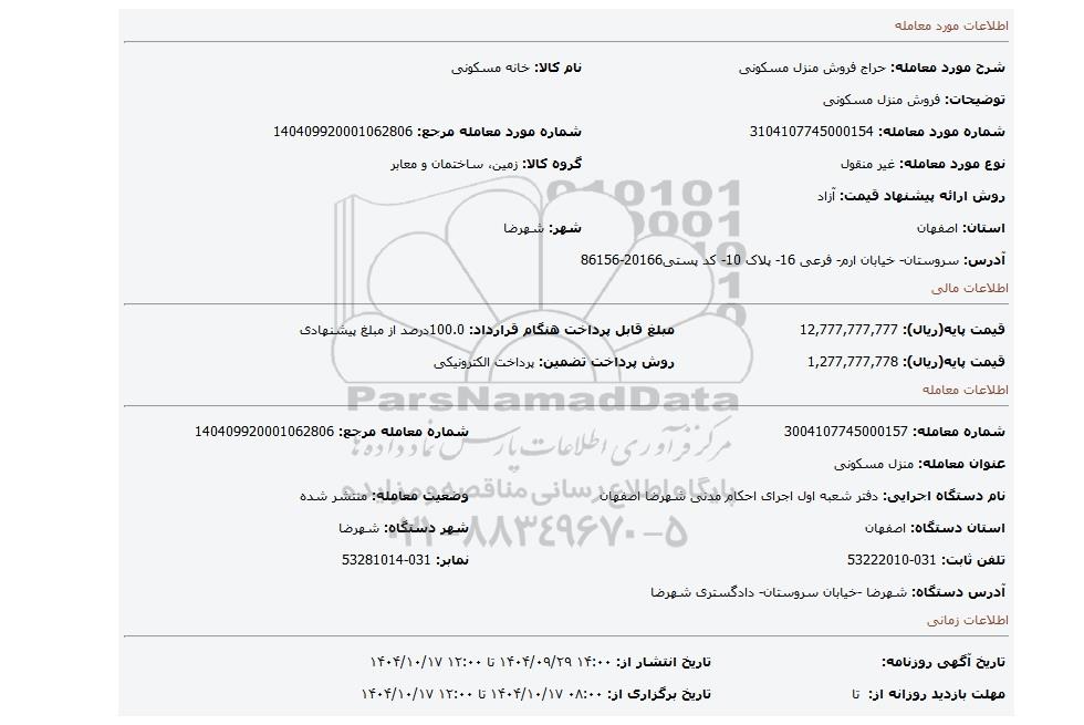 | شرح مورد معامله: حراج فروش منزل مسکونی | نام کالا: خانه مسکونی | |