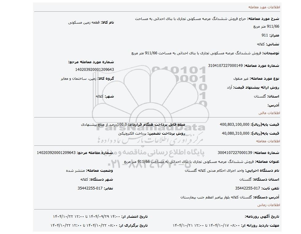 | شرح مورد معامله: حراج فروش ششدانگ عرصه مسکونی تجاری با بنای احداثی به مساحت 911/66 متر مربع | نام کالا: قطعه زمین مسکونی | |