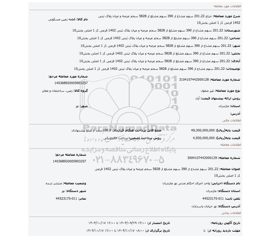 | شرح مورد معامله: حراج 201.22 سهم مشاع از 390 سهم مشلع از 5828 سخم عرصه و عیان پلاک ثبتی 1402 فرعی 1ز 1 اصلی بخش10 | نام کالا: قطعه زمین مسکونی | |