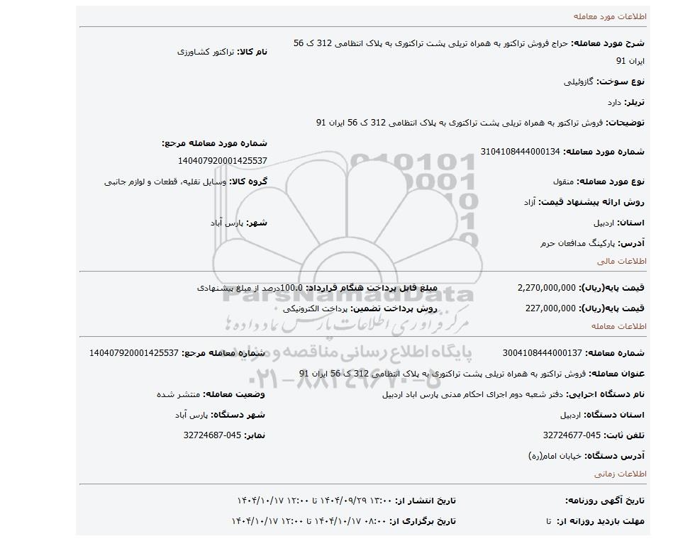 | عنوان معامله: فروش تراکتور به همراه تریلی پشت تراکتوری به پلاک انتظامی 312 ک 56 ایران 91 | ||