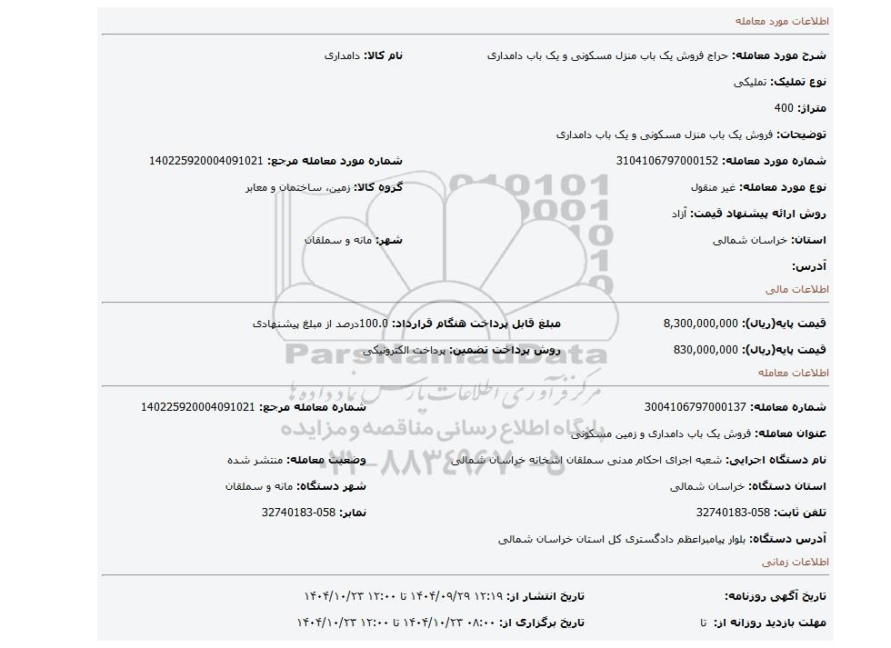 قیمت پایه(ریال): 830,000,000روش پرداخت تضمین: پرداخت الکترونیکی
