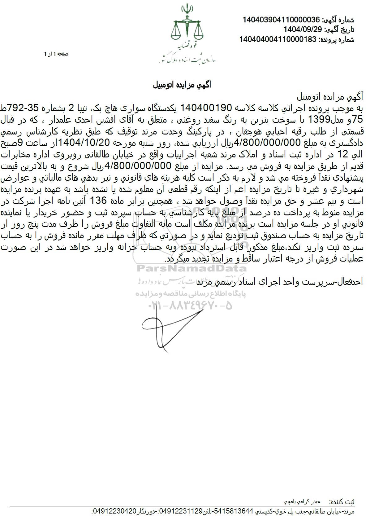 به موجب پرونده اجرائی کلاسه كلاسه 140400190 یک دستگاه سواری هاچ بک تیبا 2 بشماره 35-792 ط 75 و مدل 1399 با سوخت بنزین به رنگ سفید روغنی ، متعلق به آقای افشین احدي علمدار ، که در قبال قسمتی از طلب رقیه احبابي هوجقان ، در پارکینگ وحدت مرند توقیف که طبق نظریه کارشناس رسمي دادگستری به مبلغ 4.800.000.000 ريال ارزیابی شده روز شنبه مورخه 1404.10.20 از ساعت 9 صبحالي 12 در اداره ثبت اسناد و املاک مرند شعبه اجراییات واقع در خیابان طالقانی روبروی اداره مخابرات قدیم از طریق مزایده به فروش می رسد. مزایده از مبلغ 4.800.000.000 ريال شروع و به بالاترین قیمت پيشنهادي نقداً فروخته مي شد و لازم به ذکر است کلیه هزینه هاي قانوني و نيز بدهي هاي مالياتي و عوارض شهرداری و غیره تا تاریخ مزایده اعم از اینکه رقم قطعي آن معلوم شده یا نشده باشد به عهده برنده مزایده است و نیم عشر و حق مزایده نقداً وصول خواهد شد ، همچنین برابر ماده 136 آئین نامه اجرا شرکت در مزایده منوط به پرداخت ده درصد از مبلغ پایه کارشناسی به حساب سپرده ثبت و حضور خریدار یا نماینده قانوني او در جلسه مزایده است برنده مزایده مکلف است ما به التفاوت مبلغ فروش را ظرف مدت پنج روز از تاریخ مزایده به حساب صندوق ثبت تودیع نماید و در صورتی که ظرف مهلت مقرر مانده فروش را به حساب سپرده ثبت واریز نکند مبلغ مذکور قابل استرداد نبوده و به حساب خزانه واریز خواهد شد در این صورت عملیات فروش از درجه اعتبار ساقط و مزایده تجدید میگردد.