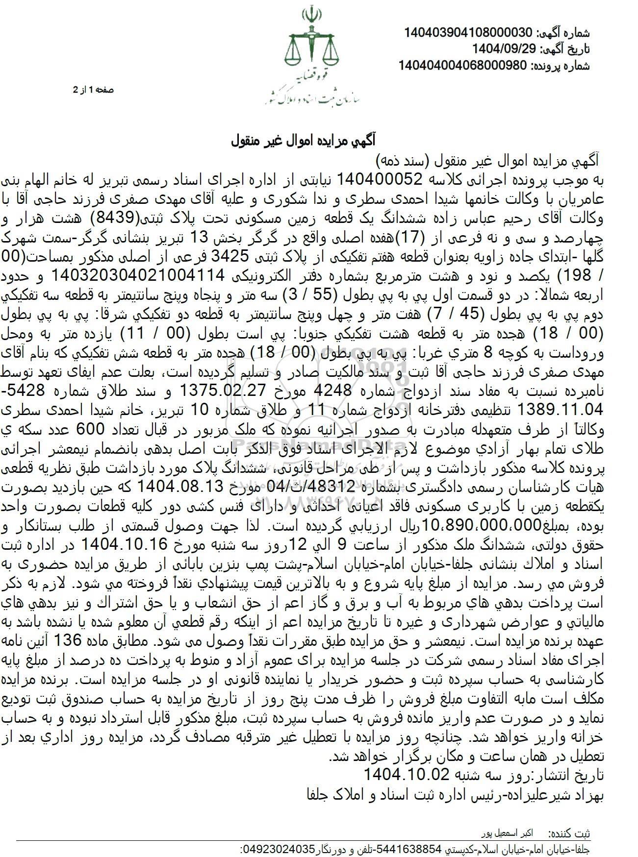 به موجب پرونده اجرائی کلاسه 140400052 نیابتی از اداره اجرای اسناد رسمی تبریز له خانم الهام بنی عامریان با وکالت خانمها شیدا احمدی سطری و ندا شکوری و علیه آقای مهدی صفری فرزند حاجی آقا با وكالت آقای رحیم عباس زاده ششدانگ یک قطعه زمین مسکونی تحت پلاک ثبتی (8439) هشت هزار و چهارصد و سی و نه فرعی از (17) هفده اصلی واقع در گرگر بخش 13 تبریز بنشانی گرگر - سمت شهرک گلها - ابتدای جاده زاویه بعنوان قطعه هفتم تفکیکی از پلاک ثبتی 3425 فرعی از اصلی مذكور بمساحت 00) . 198 یکصد و نود و هشت متر مربع بشماره دفتر الکترونیکی 140320304021004114 و حدود اربعه شمالا در دو قسمت اول پی به پی بطول (55) . (3) سه متر و پنجاه و پنج سانتیمتر به قطعه سه تفكیكی دوم پی به پی بطول (45) . (7) هفت متر و چهل و پنج سانتیمتر به قطعه دو تفكیكی شرقا پی به پی بطول (00 . (18) هجده متر به قطعه هشت تفکیکی جنوبا پی است بطول (00 . (11) یازده متر به و محل ورود است به کوچه 8 متری غربا پی به پی بطول (00 . (18) هجده متر به قطعه شش تفکیکی که بنام آقای مهدی صفری فرزند حاجی آقا ثبت و سند مالکیت صادر و تسلیم گردیده است بعلت عدم ایفای تعهد توسط نامبرده نسبت به مفاد سند ازدواج شماره 4248 مورخ 1375.02.27 و سند طلاق شماره 5428 1389.11.04 تنظیمی دفترخانه ازدواج شماره 11 و طلاق شماره 10 تبریز خانم شیدا احمدی سطری وکالتا از طرف متعهدله مبادرت به صدور اجرائیه نموده که ملک مزبور در قبال تعداد 600 عدد سكه ی طلای تمام بهار آزادی موضوع لازم الاجرای اسناد فوق الذكر بابت اصل بدهی بانضمام نیمعشر اجرائی پرونده کلاسه مذکور بازداشت و پس از طی مراحل قانونی ششدانگ پلاک مورد بازداشت طبق نظریه قطعی هیات کارشناسان رسمی دادگستری بشماره 48312 . 04 مورخ 1404.08.13 که حین بازدید بصورت یكقطعه زمین با کاربری مسکونی فاقد اعیانی احداثی و دارای فنس کشی دور کلیه قطعات بصورت واحد بوده. بمبلغ 890.000.000. 10 ریال ارزیابی گردیده است. لذا جهت وصول قسمتی از طلب بستانکار و حقوق دولتی ششدانگ ملک مذکور از ساعت 9 الی 12 روز سه شنبه مورخ 1404.10.16 در اداره ثبت استاد و املاک بنشانی جلفا - خیابان امام خیابان اسلام - پشت پمپ بنزین بابائی از طریق مزایده حضوری به فروش میرسد مزایده از مبلغ پایه شروع و به بالاترین قیمت پیشنهادی نقدا فروخته می شود. لازم به ذکر است پرداخت بدهی های مربوط به آب و برق و گاز اعم از حق انشعاب و یا حق اشتراك و نیز بدهی های مالیاتی و عوارض شهرداری و غیره تا تاریخ مزایده اعم از اینکه رقم قطعی آن معلوم شده یا نشده باشد به عهده برنده مزایده است. نیمعشر و حق مزایده طبق مقررات نقداً وصول میشود مطابق ماده 136 آئین نامه اجرای مفاد اسناد رسمی شرکت در جلسه مزایده برای عموم آزاد و منوط به پرداخت ده درصد از مبلغ پایه کارشناسی به حساب سپرده ثبت و حضور خریدار یا نماینده قانونی او در جلسه مزایده است. برنده مزایده مکلف است ما به التفاوت مبلغ فروش را ظرف مدت پنج روز از تاریخ مزایده به حساب صندوق ثبت تودیع نماید و در صورت عدم واریز مانده فروش به حساب سپرده ثبت مبلغ مذکور قابل استرداد نبوده و به حساب خزانه واریز خواهد شد. چنانچه روز مزایده با تعطیل غیر مترقبه مصادف گردد مزایده روز اداری بعد از تعطیل در همان ساعت و مکان برگزار خواهد شد.