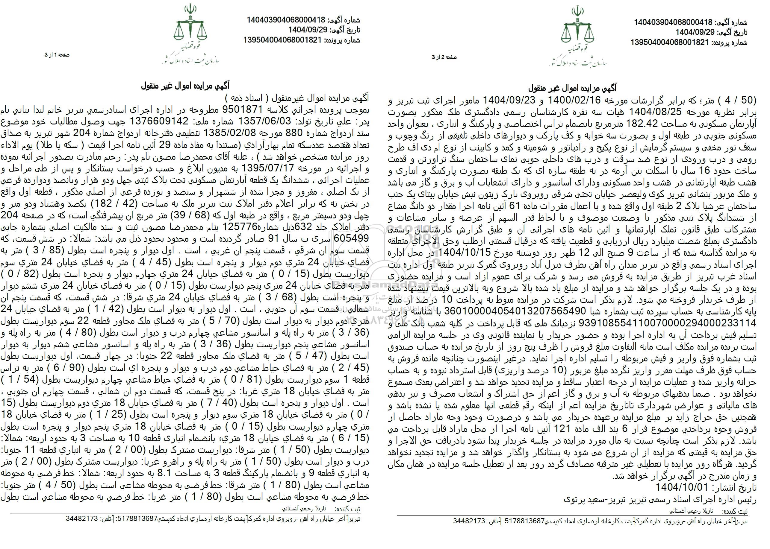 بموجب پرونده اجرائی کلاسه 9501871 مطروحه در اداره اجرای اسناد رسمی تبریز خانم لیدا نباتی نام یدر علی تاریخ تولد: 1357.06.03 شماره ملی 1376609142 جهت وصول مطالبات خود موضوع سند ازدواج شماره 880 مورخه 1385.02.08 تنظیمی دفترخانه ازدواج شماره 204 شهر تبریز به صداق تعداد هفتصد عدد سکه تمام بهار آزادی مستندا به مفاد ماده 29 آئین نامه اجرا قیمت ) سکه یا طلا) یوم الاداء روز مزایده مشخص خواهد شد ) ، علیه آقای محمدرضا مصون نام پدر رحیم مبادرت بصدور اجرائیه نموده و اجرائیه در مورخه 1395.07.17 به مدیون ابلاغ و حسب درخواست بستانکار و پس از طی مراحل و عملیات اجرائی ، ششدانگ یک قطعه آپارتمان مسکونی تحت پلاک ثبتی چهل و دو هزار و پانصد و دوازده فرعی از یک اصلی مفرور و مجرا شده از ششهزار و سیصد و نورده فرعی از اصلی مذکور، قطعه اول واقع در بخش نه که برابر اعلام دفتر املاک ثبت تبریر ملک به مساحت (42) . (182) یکصد و هشتاد و دو متر و چهل و دو دسیمتر مربع، واقع در طبقه اول که (68) . (39) متر مربع آن پیشرفتگی است که در صفحه 204 دفتر املاک جلد 632 ذیل شماره 125776 بنام محمدرضا مصون ثبت و سند مالکیت اصلی بشماره چایی 605499 سری به سال 91 صادر گردیده است و محدود بحدود ذیل می باشد شمالا در شش قسمت که قسمت سوم ان شرقی ، قسمت پنجم أن غربی، است. اول دیوار و پنجره است بطول 85 . 3 ) متر به فضای خیابان 24 متری دوم دیوار و پنجره است بطول 45 . 4 ) متر به فضای خیابان 24 متری سوم دیواریست بطول (15) . 0 ) متر به فضای خیابان 24 متری چهارم دیوار و پنجره است بطول (82 . 0 ) متر به فضای خیابان 24 متری پنجم دیواریست بطول 15 . 0 ) متر به فضای خیابان 24 متری ششم دیوار و پنجره است بطول 68 . 3 ) متر به فضای خیابان 24 متری شرقا در شش قسمت که قسمت پنجم آن شمالی ، قسمت سوم آن جنوبی است. اول دیوار به دیوار است بطول (42) . 1 ) متر به فضای خیابان 24 متری دوم دیوار به دیوار است بطول (5.70 ) متر به فضای ملک مجاور قطعه 22 سوم دیواریست بطول (36 . 3) متر به راه پله و آسانسور مشاعی چهارم درب و دیوار است بطول 80 . 4 ) متر به راه پله و اسانسور مشاعی پنجم دیواریست بطول (36) . 3 ) متر به راه پله و اسانسور مشاعی ششم دیوار به دیوار است بطول (47 . 5 ) متر به فضای ملک مجاور قطعه 22 جنوبا در چهار قسمت اول دیواریست بطول (45 . 2 ) متر به فضای حیاط مشاعی دوم درب و دیوار و پنجره ای است بطول 90 . 6 ) متر به تراس قطعه 1 سوم دیواریست بطول 81 . 0 ) متر به فضای حیاط مشاعی چهارم دیواریست بطول (54 . 1 ) متر به فضای خیابان 18 متری غربا در پنج قسمت که قسمت دوم آن شمالی، قسمت چهارم آن جنوبی . است. اول دیوار و پنجره است بطول 40 . 7 ) متر به فضای خیابان 18 متری دوم دیواریست بطول (15) . 0 ) متر به فضای خیابان 18 متری سوم دیوار و پنجره است بطول 25 . 1 ) متر به فضای خیابان 18 متری چهارم دیواریست بطول (15) . 0 ) متر به فضای خیابان 18 متری پنجم دیوار و پنجره است بطول (15 . 6 ) متر به فضای خیابان 18 متری بانضمام انباری قطعه 10 به مساحت 3 به حدود اربعه شمالا دیواریست بطول 50 . 1 ) متر شرقا دیواریست مشترک بطول (00 . 2 ) متر به انباری قطعه 11 جنوبا درب و دیوار است بطول (50 . 1 ) متر به راه پله و راهرو غربا دیواریست مشترک بطول (00 . 2 ) متر به انباری قطعه 9 و بانضمام پارکینگ قطعه 3 به مساحت 8.1 به حدود اربعه شمالا خط فرضی به محوطه مشاعی است بطول 80 . 1 ) متر شرقا خط فرضی به محوطه مشاعی است بطول 50 . 4 ) متر جنوبا خط فرضی به محوطه مشاعی است بطول 80 . 1 ) متر غربا خط فرضی به محوطه مشاعی است بطول 50 . 4 متر که برابر گزارشات مورخه 1400.02.16 و 1404.09.23 مامور اجرای ثبت تبریز و( برابر نظریه مورخه 1404.08.25 هیات سه نفره کارشناسان رسمی دادگستری ملک مذکور بصورت آپارتمان مسکونی به مساحت 182.42 متر مربع بانضمام تراس اختصاصی و پارکینگ و انباری ، بعنوان واحد مسکونی جنوبی در طبقه اول و بصورت سه خوابه و کف پارکت و دیوارهای داخلی تلفیقی از رنگ وجوب و سقف نور مخفی و سیستم گرمایش از نوع پکیج و رادیاتور و شومینه و کمد و کابینت از نوع ام دی اف طرحرومی و درب ورودی از نوع ضد سرقت و دربهای داخلی چوبی نمای ساختمان سنگ ترا