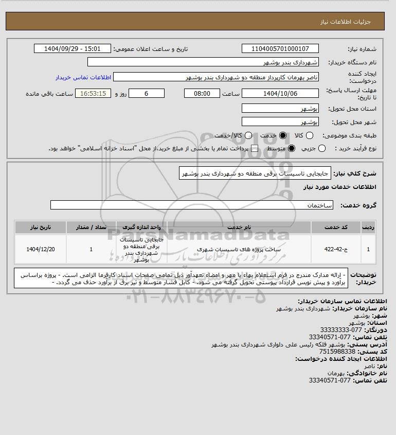 شرح کلی نیاز: جابجایی تاسیسات برقی منطقه دو شهرداری بندر بوشهر