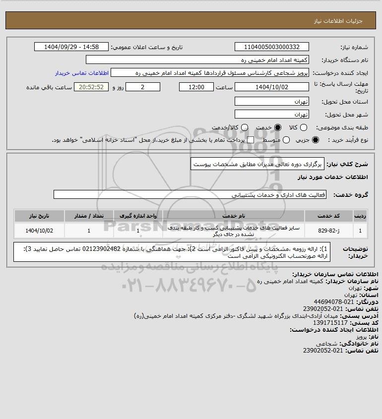 شرح کلی نیاز: برگزاری دوره تعالی مدیران مطابق مشخصات پیوست