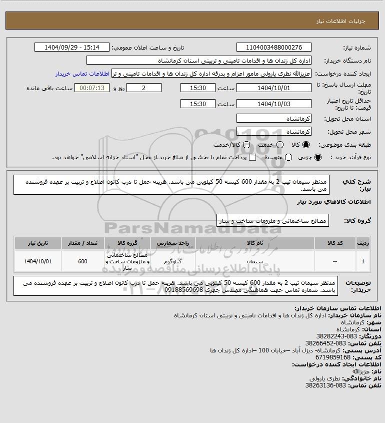 شرح کلی نیاز: مدنظر سیمان تیپ 2 به مقدار 600 کیسه 50 کیلویی می باشد. هزینه حمل تا درب کانون اصلاح و تربیت بر عهده فروشنده می باشد.