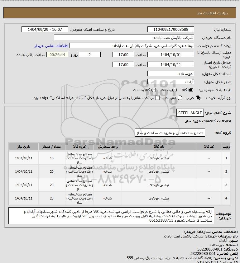 | 4 | -- | نبشی فولادی | شاخه | مصالح ساختمانی و ملزومات ساخت و ساز | 20 | 1404/10/11 |