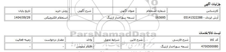 | آرش ایزدی - 05141522288 | 163695 | تسمه سوراخدار ارتینگ | استعلام الکترونیکی | 1404/09/29 |