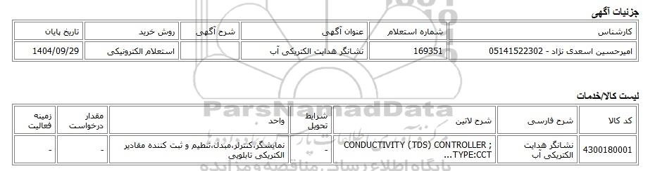 | امیرحسین اسعدی نژاد - 05141522302 | 169351 | نشانگر هدایت الکتریکی آب | استعلام الکترونیکی | 1404/09/29 |