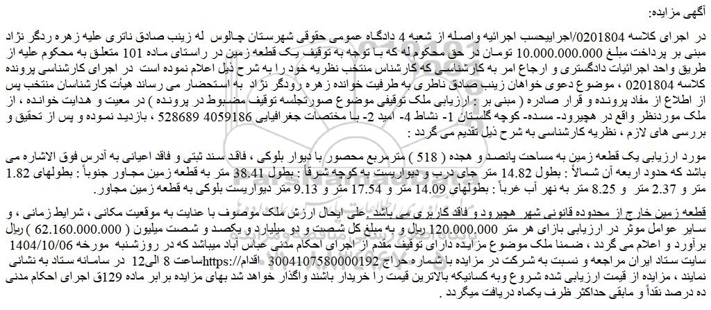 در اجرای کلاسه 0201804/اجراییحسب اجرائیه واصله از شعبه 4 دادگاه عمومی حقوقی شهرستان چالوس  له زینب صادق ناتری علیه زهره ردگر نژاد مبنی بر پرداخت مبلغ 10.000.000.000 تومان در حق محکوم له که با توجه به توقیف یک قطعه زمین در راستای ماده 101 متعلق به محکوم علیه از طریق واحد اجرائیات دادگستری و ارجاع امر به کارشناسی که کارشناس منتخب نظریه خود را به شرح ذیل اعلام نموده است  در اجرای کارشناسی پرونده کلاسه 0201804 ، موضوع دعوی خواهان زینب صادق ناطری به طرفیت خوانده زهره رودگر نژاد  به استحضار می رساند هیأت کارشناسان منتخب پس از اطلاع از مفاد پرونده و قرار صادره ( مبنی بر : ارزیابی ملک توقیفی موضوع صورتجلسه توقیف مضبوط در پرونده ) در معیت و هدایت خوانده ، از ملک موردنظر واقع در هچیرود- مسده- کوچه گلستان 1- نشاط 4- امید 2- با مختصات جغرافیایی 4059186 528689 ، بازدید نموده و پس از تحقیق و بررسی های لازم ، نظریه کارشناسی به شرح ذیل تقدیم می گردد :
