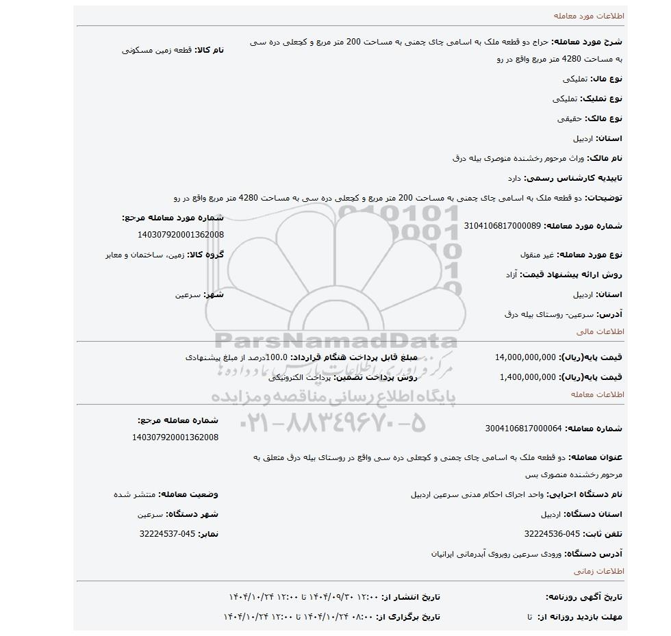 مزایده عمومی مزایده دو قطعه ملک به اسامی چای چمنی به مساحت 200 متر مربع و کچعلی دره سی به مساحت 4280 متر مربع واقع در رو برگزار میگردد. از کلیه افراد متخصص و شرکت‌های واجد شرایط دعوت به عمل می‌آید تا در این مزایده با کد خبرگزاری پارس نماد : 10029886 شرکت نمایند تاریخ شروع مزایده : 1404/09/30 مهلت شرکت در مزایده: تا پایان روز 1404/10/24 مکان برگزاری اموال واگذاری استان‌های مزایدات استان اردبیل و دسته‌بندی‌های مربوط به این حراجی املاک و زمین میباشد.