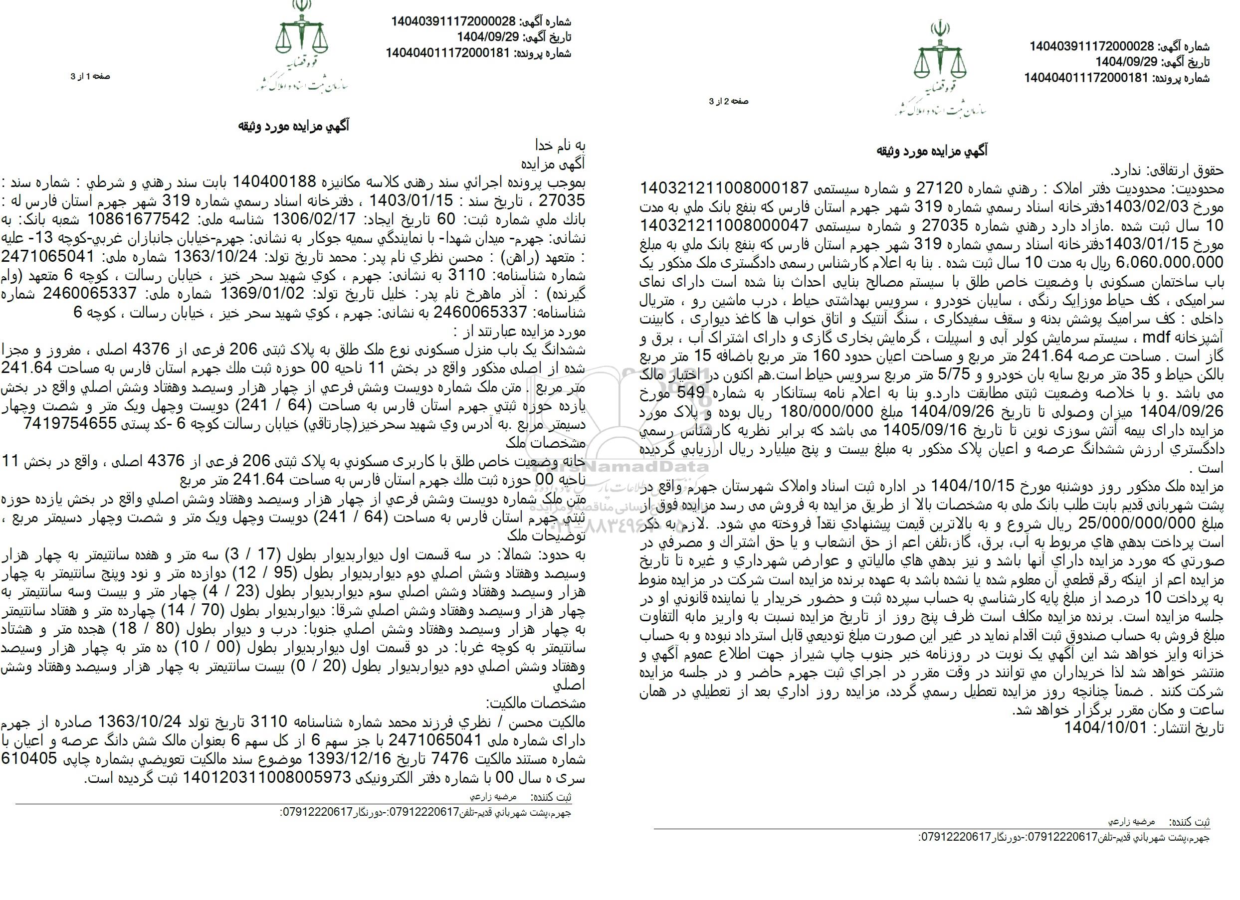 بموجب پرونده اجرائي سند رهنی کلاسه مکانیزه 140400188 بابت سند رهنی و شرطی : شماره سند : 27035 ، تاریخ سند : 1403.01.15 ، دفترخانه اسناد رسمی شماره 319 شهر جهرم استان فارس له : بانك ملي شماره ثبت 60 تاریخ ایجاد 1306.02.17 شناسه ملی: 10861677542 شعبه بانک به نشانی جهرم میدان شهدا با نمایندگی سمیه جوکار به نشانی جهرم - خیابان جانبازان غربي - کوچه 13- عليه متعهد (راهن) : محسن نظری نام پدر محمد تاریخ تولد: 1363.10.24 شماره ملی: 2471065041 شماره شناسنامه 3110 به نشانی جهرم ، کوي شهيد سحر خیز ، خیابان رسالت ، کوچه 6 متعهد وام گیرنده : آذر ماهرخ نام پدر خلیل تاریخ تولد: 1369.01.02 شماره ملی 2460065337 شماره شناسنامه: 2460065337 به نشانی جهرم ، کوی شهید سحر خیز ، خیابان رسالت ، کوچه 6