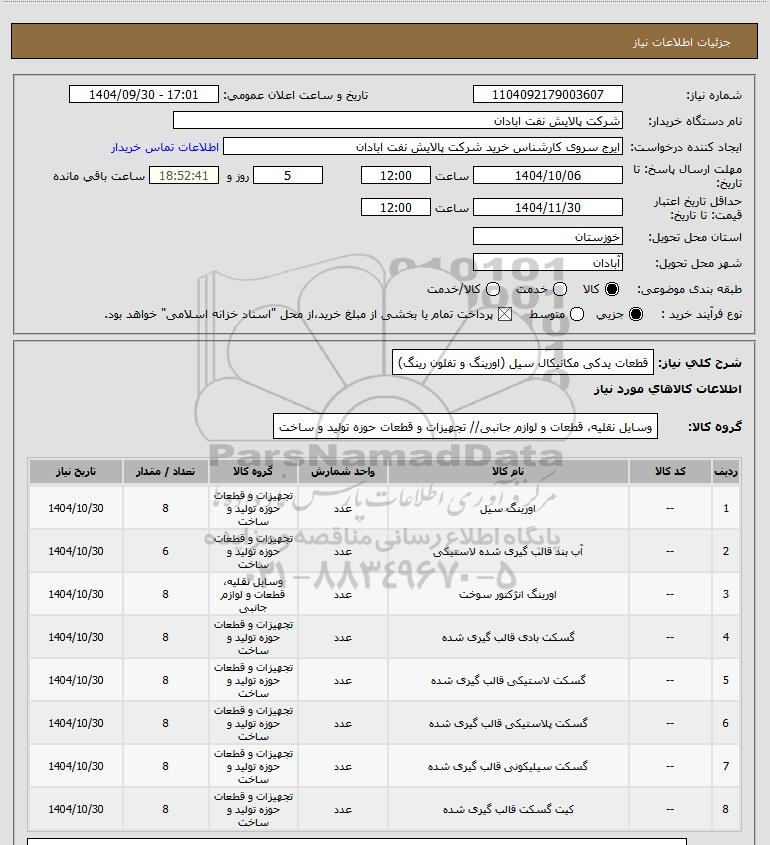 | 1 | -- | اورینگ سیل | عدد | تجهیزات و قطعات حوزه تولید و ساخت | 8 | 1404/10/30 |