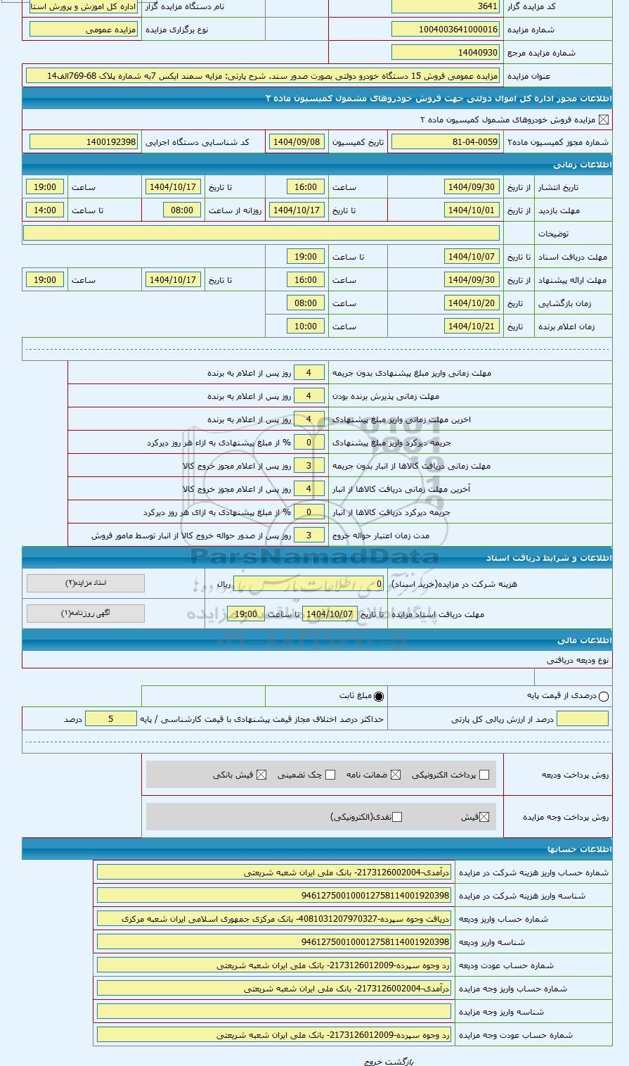 عنوان مزایدهمزایده عمومی فروش 15 دستگاه خودرو دولتی بصورت صدور سند