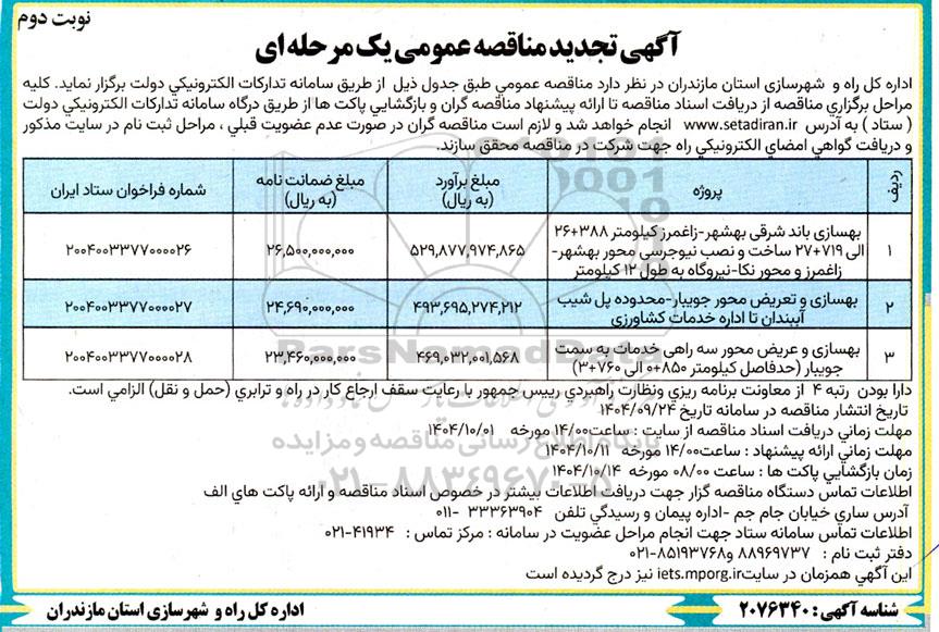 اداره کل راه و شهرسازی استان مازندران در نظر دارد مناقصه عمومی طبق جدول ذیل از طریق سامانه تدارکات الکترونیکی دولت برگزار نماید. کلیه مراحل برگزاری مناقصه از دریافت اسناد مناقصه تا ارائه پیشنهاد مناقصه گران و بازگشایی پاکت ها از طریق درگاه سامانه تدارکات الكترونیكی دولت (ستاد) انجام خواهد شد و لازم است مناقصه گران در صورت عدم عضویت قبلی ، مراحل ثبت نام در سایت مذکور و دریافت گواهی امضای الکترونیکی راه جهت شرکت در مناقصه محقق سازند.