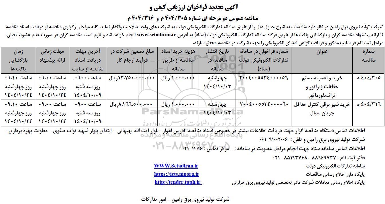 آگهی تجدید فراخوان ارزیابی کیفی و مناقصه عمومی دو مرحله ای شماره 404.305 م و 404.316 م ؟