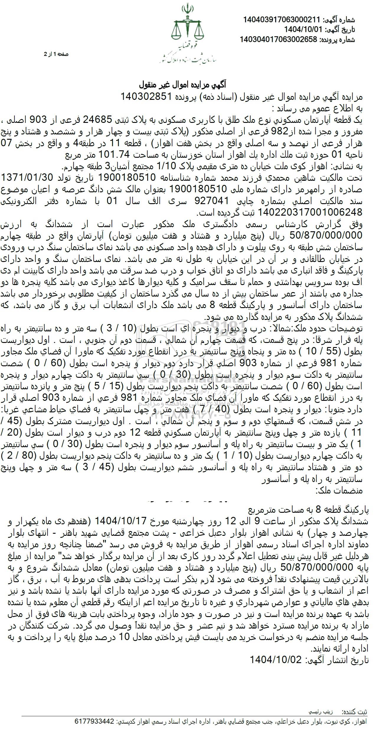 یک قطعه آپارتمان مسکونی نوع ملک طلق با کاربری مسکونی به پلاک ثبتی 24685 فرعی از 903 اصلی . مفرور و مجزا شده از 982 فرعی از اصلی مذکور پلاک ثبتی بیست و چهار هزار و ششصد و هشتاد و پنج هزار فرعی از نهصد و سه اصلی واقع در بخش هفت اهواز ، قطعه 11 در طبقه 4 و واقع در بخش 07 ناحیه 01 حوزه ثبت ملک اداره یک اهواز استان خوزستان به مساحت 101.74 متر مربع به نشانی اهواز کوی ملت خیابان ده متری مقیمی پلاک 1.10 مجتمع آشیان 3 طبقه چهارم