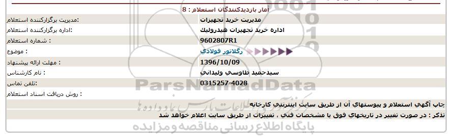 اداره برگزارکننده استعلام: اداره خرید تجهیزات هیدرولیک