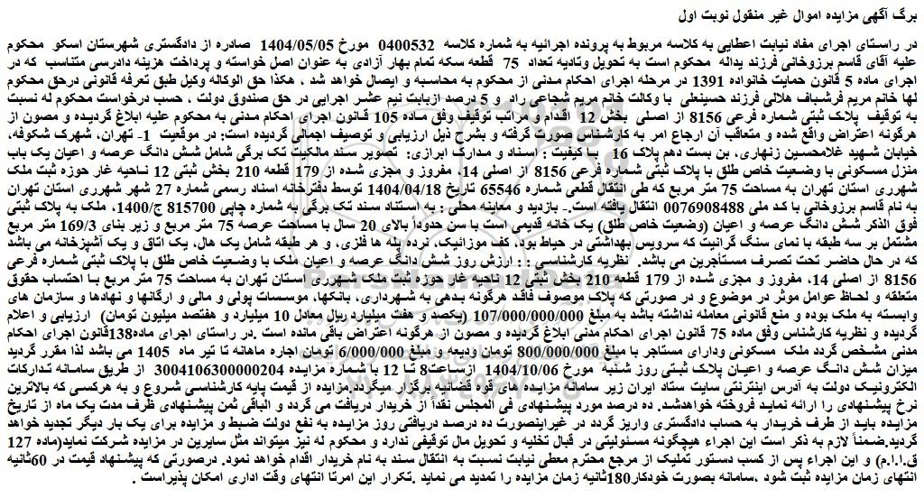 در راستای اجرای مفاد نیابت اعطایی به کلاسه مربوط به پرونده اجرائیه به شماره کلاسه 0400532 مورخ 1404/05/05 صادره از دادگستری شهرستان اسکو محکوم علیه آقای قاسم برزوخانی فرزند یداله محکوم است به تحویل وتادیه تعداد 75 قطعه سکه تمام بهار آزادی به عنوان اصل خواسته و پرداخت هزینه دادرسی متناسب که در اجرای ماده 5 قانون حمایت خانواده 1391 در مرحله اجرای احکام مدنی از محکوم به محاسبه و ایصال خواهد شد ، هکذا حق الوکاله وکیل طبق تعرفه قانونی درحق محکوم لها خانم مریم فرشباف هلالی فرزند حسینعلی با وکالت خانم مریم شجاعی راد و 5 درصد ازبابت نیم عشر اجرایی در حق صندوق دولت ، حسب درخواست محکوم له نسبت به توقیف پلاک ثبتی شماره فرعی 8156 از اصلی بخش 12 اقدام و مراتب توقیف وفق ماده 105 قانون اجرای احکام مدنی به محکوم علیه ابلاغ گردیده و مصون از هرگونه اعتراض واقع شده و متعاقب آن ارجاع امر به کارشناس صورت گرفته و بشرح ذیل ارزیابی و توصیف اجمالی گردیده است: در موقعیت 1- تهران، شهرک شکوفه، خیابان شهید غلامحسین زنهاری، بن بست دهم پلاک 16 با کیفیت : اسناد و مدارک ابرازی: تصویر سند مالکیت تک برگی شامل شش دانگ عرصه و اعیان یک باب منزل مسکونی با وضعیت خاص طلق با پلاک ثبتی شماره فرعی 8156 از اصلی 14، مفروز و مجزی شده از 179 قطعه 210 بخش ثبتی 12 ناحیه غار حوزه ثبت ملک شهرری استان تهران به مساحت 75 متر مربع که طی انتقال قطعی شماره 65546 تاریخ 1404/04/18 توسط دفترخانه اسناد رسمی شماره 27 شهر شهرری استان تهران به نام قاسم برزوخانی با کد ملی 0076908488 انتقال یافته است.- بازدید و معاینه محلی : به استناد سند تک برگی به شماره چاپی 815700 ج/1400، ملک به پلاک ثبتی فوق الذکر شش دانگ عرصه و اعیان (وضعیت خاص طلق) یک خانه قدیمی است با سن حدوداً بالای 20 سال با مساحت عرصه 75 متر مربع و زیر بنای 169/3 متر مربع مشتمل بر سه طبقه با نمای سنگ گرانیت که سرویس بهداشتی در حیاط بود، کف موزائیک، نرده پله ها فلزی، و هر طبقه شامل یک هال، یک اتاق و یک آشپزخانه می باشد که در حال حاضر تحت تصرف مستأجرین می باشد. نظریه کارشناسی : : ارزش روز شش دانگ عرصه و اعیان ملک با وضعیت خاص طلق با پلاک ثبتی شماره فرعی 8156 از اصلی 14، مفروز و مجزی شده از 179 قطعه 210 بخش ثبتی 12 ناحیه غار حوزه ثبت ملک شهرری استان تهران به مساحت 75 متر مربع با احتساب حقوق متعلقه و لحاظ عوامل موثر در موضوع و در صورتی که پلاک موصوف فاقد هرگونه بدهی به شهرداری، بانکها، موسسات پولی و مالی و ارگانها و نهادها و سازمان های وابسته به ملک بوده و منع قانونی معامله نداشته باشد به مبلغ 107/000/000/000 (یکصد و هفت میلیارد ریال معادل 10 میلیارد و هفتصد میلیون تومان) ارزیابی و اعلام گردیده و نظریه کارشناس وفق ماده 75 قانون اجرای احکام مدنی ابلاغ گردیده و مصون از هرگونه اعتراض باقی مانده است .در راستای اجرای ماده138قانون اجرای احکام مدنی مشخص گردد ملک مسکونی ودارای مستاجر با مبلغ 800/000/000 تومان ودیعه و مبلغ 6/000/000 تومان اجاره ماهانه تا تیر ماه 1405 می باشد لذا مقرر گردید میزان شش دانگ عرصه و اعیان پلاک ثبتی روز شنبه مورخ 1404/10/06 ازساعت8 تا 12 با شماره مزایده 3004106300000204 از طریق سامانه تدارکات الکترونیک دولت به آدرس اینترنتی سایت ستاد ایران زیر سامانه مزایده های قوه قضائیه برگزار میگردد.مزایده از قیمت پایه کارشناسی شروع و به هرکسی که بالاترین نرخ پیشنهادی را ارائه نماید فروخته خواهدشد. ده درصد مورد پیشنهادی فی المجلس نقداً از خریدار دریافت می گردد و الباقی ثمن پیشنهادی ظرف مدت یک ماه از تاریخ مزایده باید از طرف خریدار به حساب دادگستری واریز گردد در غیراینصورت ده درصد دریافتی روز مزایده به نفع دولت ضبط و مزایده برای یک بار دیگر تجدید خواهد گردید.ضمناً لازم به ذکر است این اجراء هیچگونه مسئولیتی در قبال تخلیه و تحویل مال توقیفی ندارد و محکوم له نیز میتواند مثل سایرین در مزایده شرکت نماید(ماده 127 ق.ا.ا.م) و این اجراء پس از کسب دستور تملیک از مرجع محترم معطی نیابت نسبت به انتقال سن