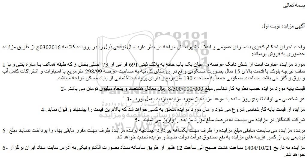واحد اجرای احکام کیفری دادسرای عمومی و انقلاب شهرستان مراغه در نظر دارد مال توقیفی ذیل را در پرونده کلاسه 0302016ج از طریق مزایده حضوری به فروش برساند: