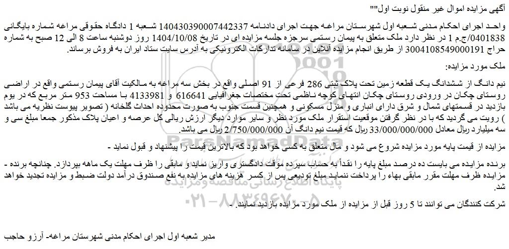 واحد اجرای احکام مدنی شعبه اول شهرستان مراغه جهت اجرای دادنامه 140430390007442337 شعبه 1 دادگاه حقوقی مراغه شماره بایگانی 0401838/ج.م 1 در نظر دارد ملک متعلق به پیمان رستمی سرجزه جلسه مزایده ای در تاریخ 1404/10/08 روز دوشنبه ساعت 8 الی 12 صبح به شماره حراج 3004108549000191 از طریق انجام مزایده آنلاین در سامانه تدارکات الکترونیکی به آدرس سایت ستاد ایران به فروش برساند.