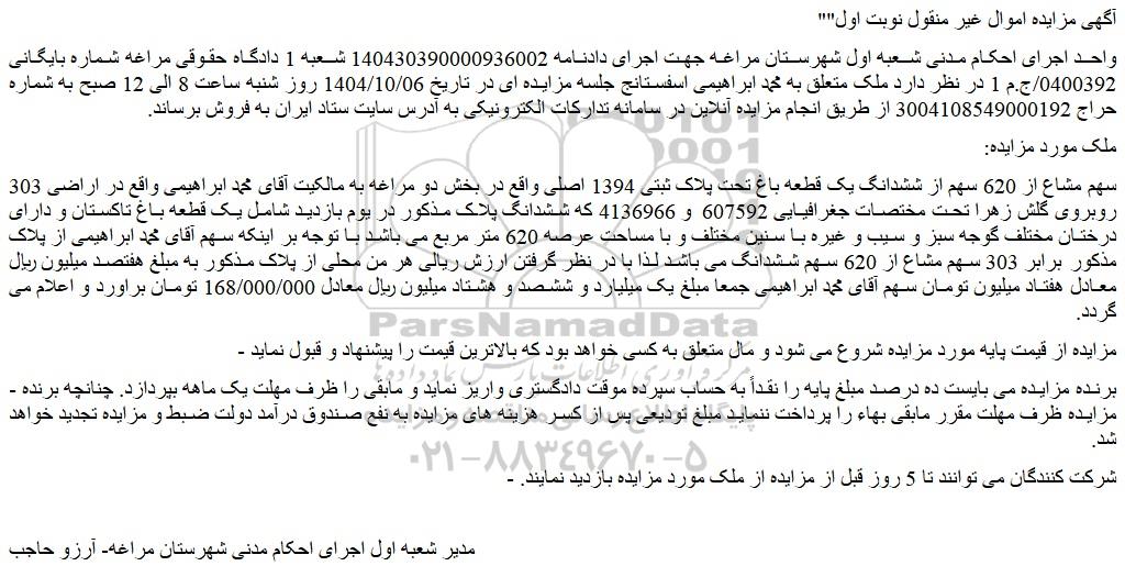 واحد اجرای احکام مدنی شعبه اول شهرستان مراغه جهت اجرای دادنامه 140430390000936002 شعبه 1 دادگاه حقوقی مراغه شماره بایگانی 0400392/ج.م 1 در نظر دارد ملک متعلق به محمد ابراهیمی اسفستانج جلسه مزایده ای در تاریخ 1404/10/06 روز شنبه ساعت 8 الی 12 صبح به شماره حراج 3004108549000192 از طریق انجام مزایده آنلاین در سامانه تدارکات الکترونیکی به آدرس سایت ستاد ایران به فروش برساند.
