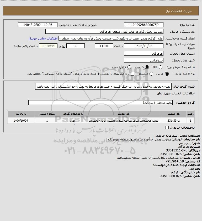 شرح کلی نیاز: تهیه و تعویض دو عدد رادیاتور اب خنک کننده و جنت های مربوط به پمپ واحد اتشنشانی انبار نفت باهنر