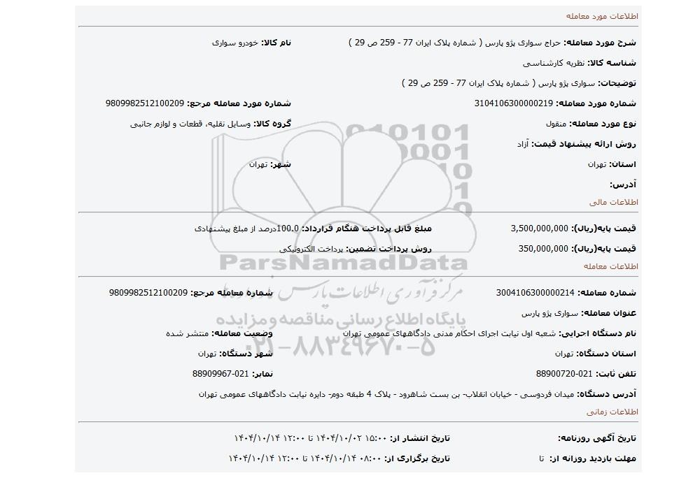 | شرح مورد معامله: حراج سواری پژو پارس ( شماره پلاک ایران 77 - 259 ص 29 ) | نام کالا: خودرو سواری | |