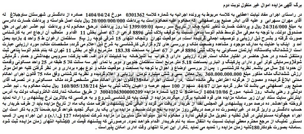 در راستای اجرای مفاد نیابت اعطایی به کلاسه مربوط به پرونده اجرائیه به شماره کلاسه 0301362 مورخ 1404/04/24 صادره از دادگستری شهرستان ساوجبلاغ له آقای مهران سهرابی و علیه آقای اباذر صنیع پوراصفهانی که محکوم علیه محکوم است به پرداخت 20/000/000/000 ریال بابت اصل خواسته و پرداخت خسارت دادرسی به مبلغ 24/316/000 ریال و پرداخت خسارت تاخیر تادیه چک از تاریخ سر رسید 1399/09/01 تا روز پرداخت درحق محکوم له و پرداخت نیم عشر اجرایی در حق صندوق دولت، با توجه به معرفی مال توسط خانم آتوسا پناهی نسبت به توقیف پلاک ثبتی 8896 فرعی از 67 اصلی بخش 11 اقدام و متعاقب آن ارجاع امر به کارشناس صورت گرفته و بشرح ذیل ارزیابی و توصیف اجمالی گردیده است: در موقعیت تهران ولنجک انتهای 15 شرقی کوچه رز پ5 ساختمان ارغوان ط 5 واحد 4 بازدید بعمل آمد و اینک با عنایت به مدارک موجود و مشاهده وضعیت ملک و بررسی های لازم گزارش کارشناسی به شرح ذیل اعلام می گردد: مشخصات ملک: مورد ارزیابی عبارت است ازششدانگ یکدستگاه آپارتمان مسکونی به پلاک ثبتی 8896 فرعی از 67 اصلی به مساحت 183.38 مترمربع واقع در بخش 11 تهران که بنام خانم آتوسا پناهی ثبت ومنتقل شده و در حال حاضر در اختیار مالک است. مورد ارزیابی دارای 3 خواب با آشپزخانه با کابینت ام دی اف، کف پارکت؛ سرویس بهداشتی و حمام ، گرمایش شوفاژوسرمایش کولر آبی و دارای پارکینگ و انباری بمساحت 5.18 متر مربع است ساختمان جنوبی و دوبر با نمای آجر سه سانت کلا 5 طبقه در 25 واحد مسکونی وقدمت آن حدودا 26 سال می باشد. نظریه کارشناسی : پس از بررسی اوضاع و احوال با توجه به مساحت و موقعیت ملک و نوع بهره برداری و در نظر گرفتن کلیه عوامل موثر ارزش ششدانگ ملک مذکور مبلغ 360.000.000.000 ریال معادل سی و شش میلیارد تومان ارزیابی و اعلام گردیده و نظریه کارشناس وفق ماده 75 قانون اجرای احکام مدنی ابلاغ گردیده و مصون از هرگونه اعتراض باقی مانده است .در راستای اجرای ماده138قانون اجرای احکام مدنی مشخص گردد ملک مسکونی و در تصرف آقای صنیع پور اصفهانی می باشد لذا مقرر گردید میزان 44/67 سهم از 100 سهم عرصه و اعیان پلاک ثبتی به مبلغ 160/805/138/214 ریال بابت محکوم به ، نیم عشر دولتی و رهنی بانک روز شنبه مورخ 1404/10/06 ازساعت8 تا 12با شماره مزایده 3004106300000209 از طریق سامانه تدارکات الکترونیک دولت به آدرس اینترنتی سایت ستاد ایران زیر سامانه مزایده های قوه قضائیه برگزار میگردد.مزایده از قیمت پایه کارشناسی شروع و به هرکسی که بالاترین نرخ پیشنهادی را ارائه نماید فروخته خواهدشد. ده درصد مورد پیشنهادی فی المجلس نقداً از خریدار دریافت می گردد و الباقی ثمن پیشنهادی ظرف مدت یک ماه از تاریخ مزایده باید از طرف خریدار به حساب دادگستری واریز گردد در غیراینصورت ده درصد دریافتی روز مزایده به نفع دولت ضبط و مزایده برای یک بار دیگر تجدید خواهد گردید.ضمناً لازم به ذکر است این اجراء هیچگونه مسئولیتی در قبال تخلیه و تحویل مال توقیفی ندارد و محکوم له نیز میتواند مثل سایرین در مزایده شرکت نماید(ماده 127 ق.ا.ا.م) و این اجراء پس از کسب دستور تملیک از مرجع محترم معطی نیابت نسبت به انتقال سند به نام خریدار اقدام خواهد نمود. درصورتی که پیشنهاد قیمت در 60ثانیه انتهای زمان مزایده ثبت شود ،سامانه بصورت خودکار180ثانیه زمان مزایده را تمدید می نماید .تکرار این امرتا انتهای وقت اداری امکان پذیراست .
