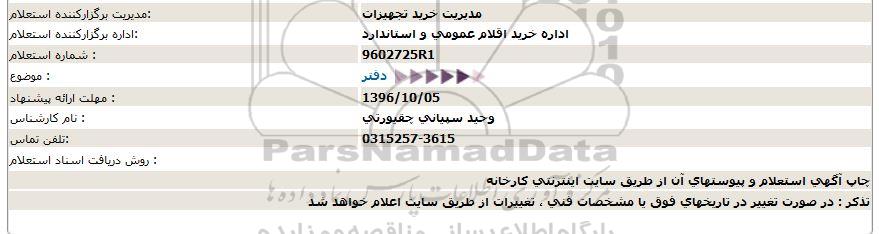 استعلام بها و موضوع استعلام استعلام,استعلام دفتر به اطلاع کلیه شرکتها و افراد متخصص واجد شرایط میرساند، آگهی گذار در نظر دارد از طریق استعلام بها، نسبت به انتخاب و دریافت پیشنهادات اقدام نماید. این استعلام با کد آگهی ثبت شده در سامانه خبرگزاری پارس نماد : 1004429 منتشر شده است. مشخصات استعلام : تاریخ شروع استعلام: 1396/09/30 آخرین مهلت ارسال پیشنهاد قیمت : 1396/10/05 و محل اجرای پروژه : استان اصفهان میباشد. استعلام قیمت مورد درخواست : استعلام,استعلام دفتر با دستهبندیهای تخصصی و گروه های مرتبط : نوشت افزار, استعلام اطلاع رسانی میگردد.