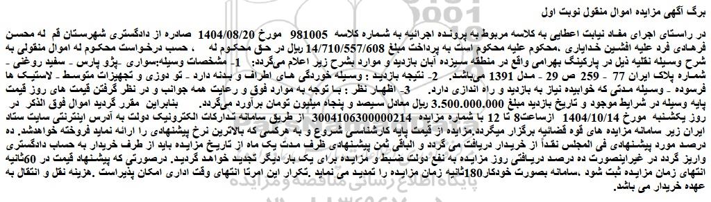 در راستای اجرای مفاد نیابت اعطایی به کلاسه مربوط به پرونده اجرائیه به شماره کلاسه  981005  مورخ 1404/08/20  صادره از دادگستری شهرستان قم  له محسن فرهادی فرد علیه افشین خدایاری ،محکوم علیه محکوم است به پرداخت مبلغ 14/710/557/608 ریال در حق محکوم له    ، حسب درخواست محکوم له اموال منقولی به شرح وسیله نقلیه ذیل در پارکینگ بهرامی واقع در منطقه سیزده آبان بازدید و موارد بشرح زیر اعلام می گردد:   1- مشخصات وسیله:سواری -پژو پارس - سفید روغنی - شماره پلاک ایران 77 - 259 ص 29 - مدل 1391 می باشد.   2- نتیجه بازدید : وسیله خوردگی های اطراف و بدنه دارد - تو دوزی و تجهیزات متوسط - لاستیک ها فرسوده - وسیله مدتی که خوابیده نیاز به بازدید و راه اندازی دارد.     3- اظهار نظر : با توجه به موارد فوق و رعایت همه جوانب و در نظر گرفتن قیمت های روز قیمت پایه وسیله در شرایط موجود و تاریخ بازدید مبلغ 3.500.000.000 ریال معادل سیصد و پنجاه میلیون تومان برآورد می گردد.      بنابراین  مقرر گردید اموال فوق الذکر  در  روز یکشنبه  مورخ 1404/10/14  ازساعت8 تا 12 با شماره مزایده  3004106300000214  از طریق سامانه تدارکات الکترونیک دولت به آدرس اینترنتی سایت ستاد ایران زیر سامانه مزایده های قوه قضائیه برگزار میگردد.مزایده از قیمت پایه کارشناسی شروع و به هرکسی که بالاترین نرخ پیشنهادی را ارائه نماید فروخته خواهدشد. ده درصد مورد پیشنهادی فی المجلس نقداً از خریدار دریافت می گردد و الباقی ثمن پیشنهادی ظرف مدت یک ماه از تاریخ مزایده باید از طرف خریدار به حساب دادگستری واریز گردد در غیراینصورت ده درصد دریافتی روز مزایده به نفع دولت ضبط و مزایده برای یک بار دیگر تجدید خواهد گردید. درصورتی که پیشنهاد قیمت در 60ثانیه انتهای زمان مزایده ثبت شود ،سامانه بصورت خودکار180ثانیه زمان مزایده را تمدید می نماید .تکرار این امرتا انتهای وقت اداری امکان پذیراست .هزینه نقل و انتقال به عهده خریدار می باشد.