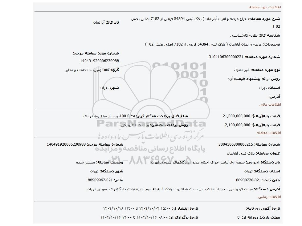 | شرح مورد معامله: حراج عرصه و اعیان آپارتمان ( پلاک ثبتی 54394 فرعی از 7182 اصلی بخش 02 ) | نام کالا: آپارتمان | |