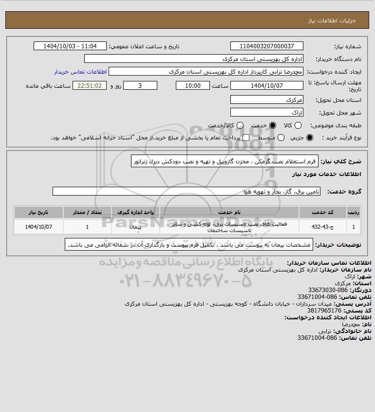 شرح کلی نیاز: فرم استعلام نصب گرمکن ، مخزن گازوییل و تهیه و نصب دودکش دیزل ژنراتور