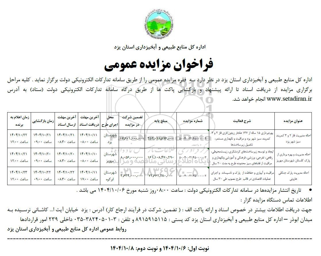 اداره کل منابع طبیعی و آبخیزداری استان یزد در نظر دارد سه فقره مزایده عمومی را از طریق سامانه تدارکات الکترونیکی دولت برگزار نماید. کلیه مراحل برگزاری مزایده از دریافت اسناد تا ارائه پیشنهاد و بازگشایی پاکتها از طریق درگاه سامانه تدارکات الکترونیکی دولت (ستاد) انجام خواهد شد .