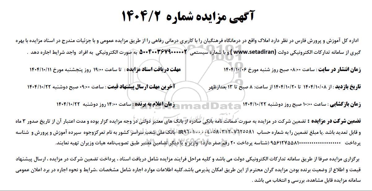 اداره کل آموزش و پرورش فارس در نظر دارد املاک واقع در درمانگاه فرهنگیان را با کاربری درمانی رفاهی را از طریق مزایده عمومی و با جزئیات مندرج در اسناد مزایده با بهره گیری از سامانه تدارکات الکترونیکی دولت (ستاد ایران) و با شماره سیستمی 5004003679000002 به صورت الکترونیکی به افراد واجد شرایط اجاره دهد.