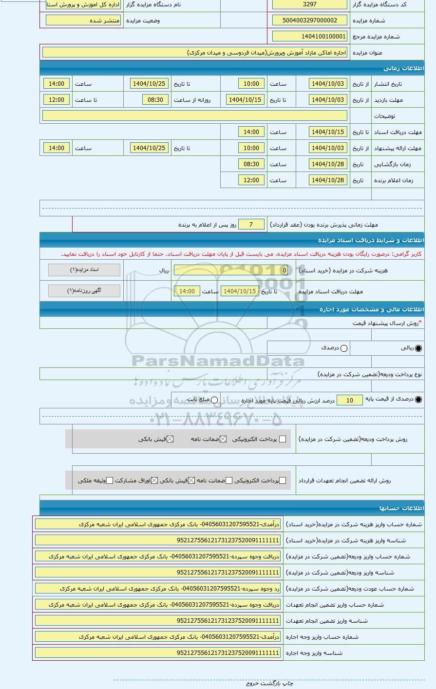 | شماره مورد اجاره | 5104003297000003 | نوع برگزاری مزایده | مزایده عمومی | |