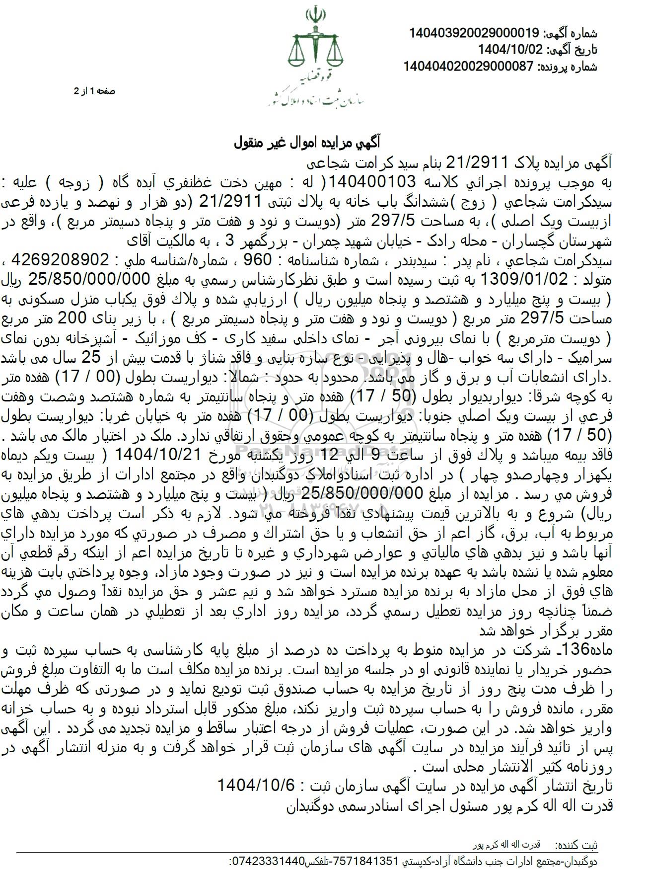 اگهی مزایده اموال غیر منقول کلاسه 140400845