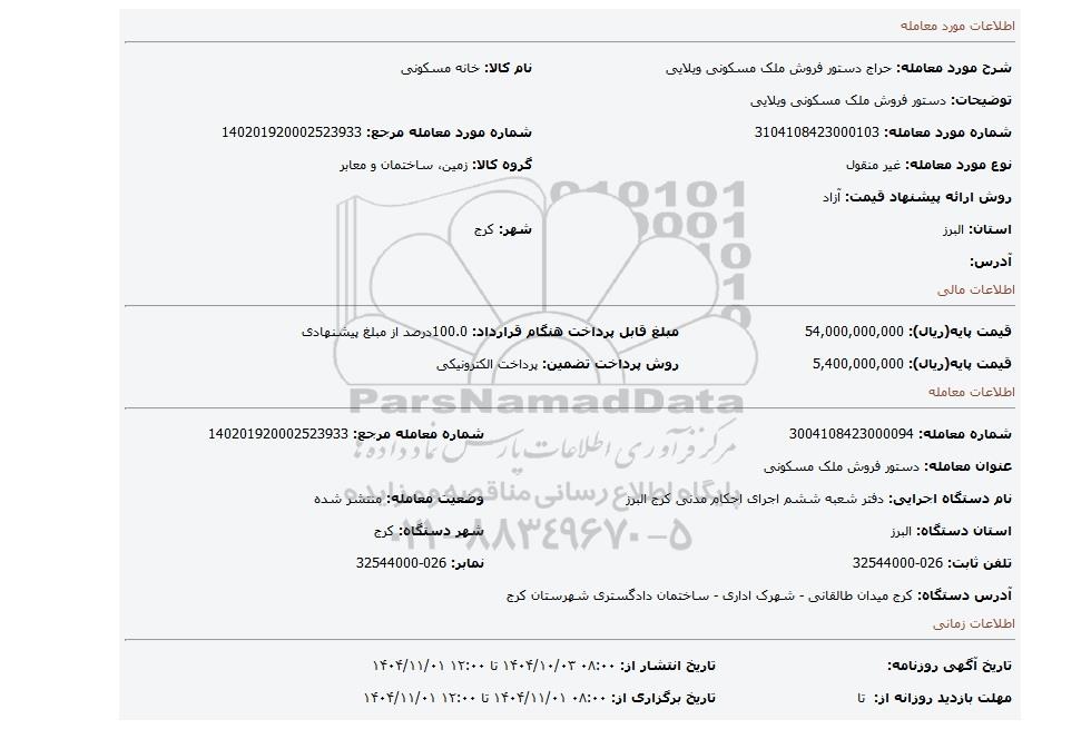 مزایده عمومی مزایده دستور فروش ملک مسکونی ویلایی برگزار میگردد. از کلیه افراد متخصص و شرکتهای واجد شرایط دعوت به عمل میآید تا در این مزایده با کد خبرگزاری پارس نماد : 10048666 شرکت نمایند تاریخ شروع مزایده : 1404/10/03 مهلت شرکت در مزایده: تا پایان روز 1404/11/01 مکان برگزاری اموال واگذاری استانهای مزایدات استان البرز و دستهبندیهای مربوط به این حراجی املاک و زمین میباشد.