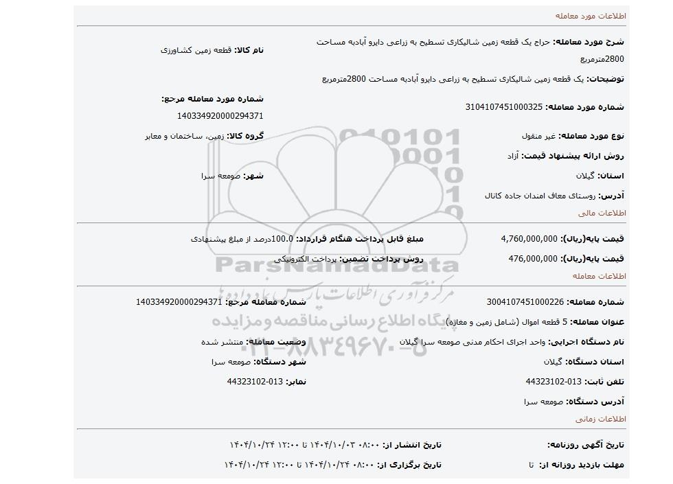 مزایده یک قطعه زمین شالیکاری تسطیح به زراعی دایرو آبادبه مساحت 2800مترمربع, مزایده، یک قطعه زمین شالیکاری تسطیح به زراعی دایرو آبادبه مساحت 2800مترمربع
