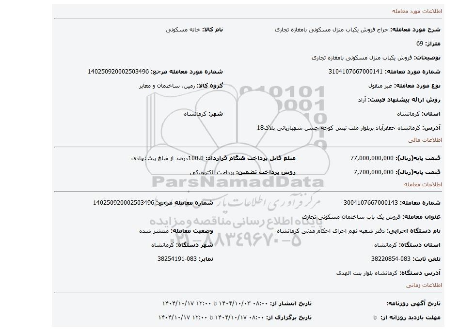 مزایده عمومی مزایده فروش یکباب منزل مسکونی بامغازه تجاری برگزار میگردد. از کلیه افراد متخصص و شرکت‌های واجد شرایط دعوت به عمل می‌آید تا در این مزایده با کد خبرگزاری پارس نماد : 10048672 شرکت نمایند تاریخ شروع مزایده : 1404/10/03 مهلت شرکت در مزایده: تا پایان روز 1404/10/17 مکان برگزاری اموال واگذاری استان‌های مزایدات استان کرمانشاه و دسته‌بندی‌های مربوط به این حراجی املاک و زمین میباشد.