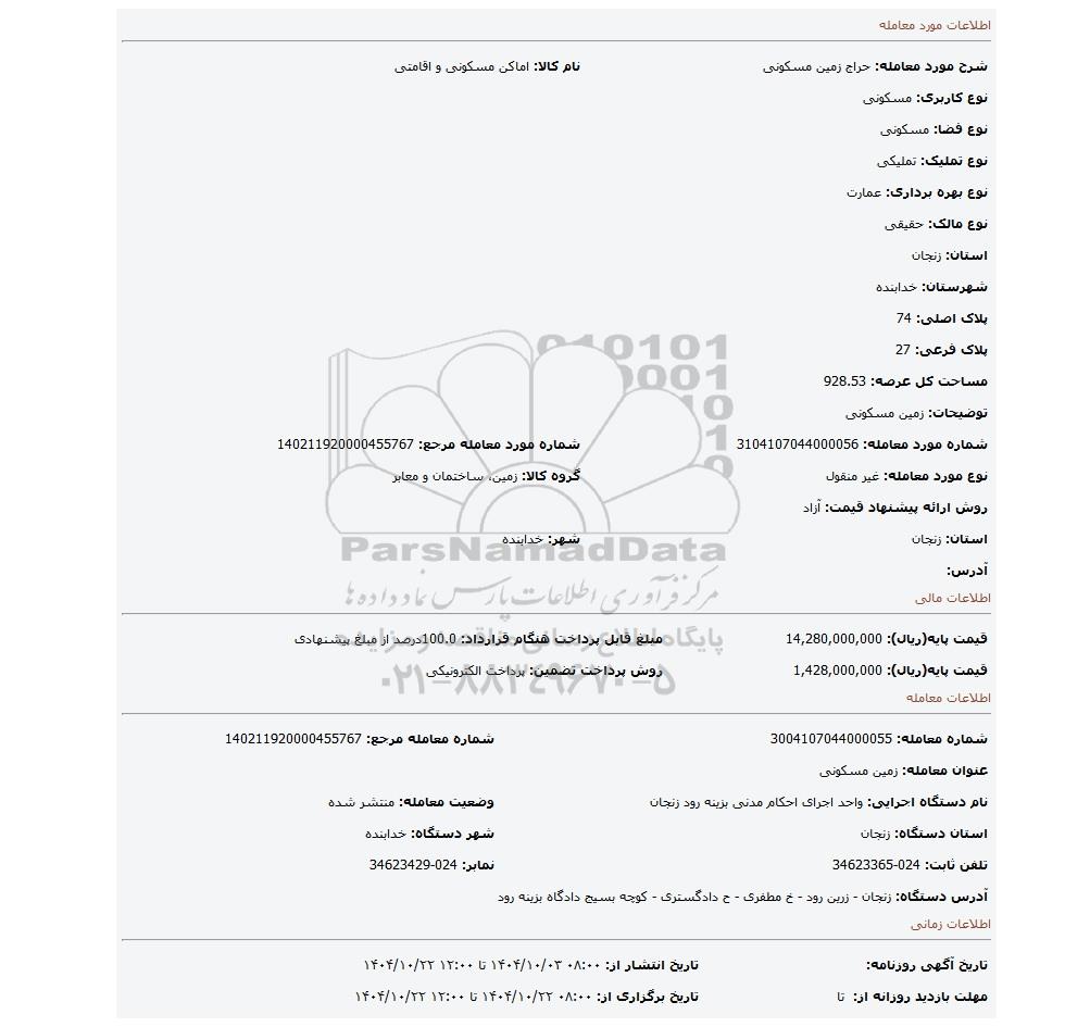 مزایده عمومی مزایده زمین مسکونی برگزار میگردد. از کلیه افراد متخصص و شرکتهای واجد شرایط دعوت به عمل میآید تا در این مزایده با کد خبرگزاری پارس نماد : 10048698 شرکت نمایند تاریخ شروع مزایده : 1404/10/03 مهلت شرکت در مزایده: تا پایان روز 1404/10/22 مکان برگزاری اموال واگذاری استانهای مزایدات استان زنجان و دستهبندیهای مربوط به این حراجی املاک و زمین میباشد.