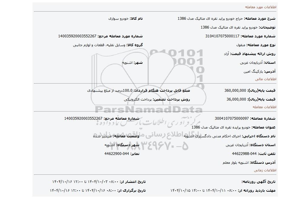| نام دستگاه اجرایی: اجرای احکام مدنی دادگستری اشنویه | وضعیت معامله: منتشر شده | |