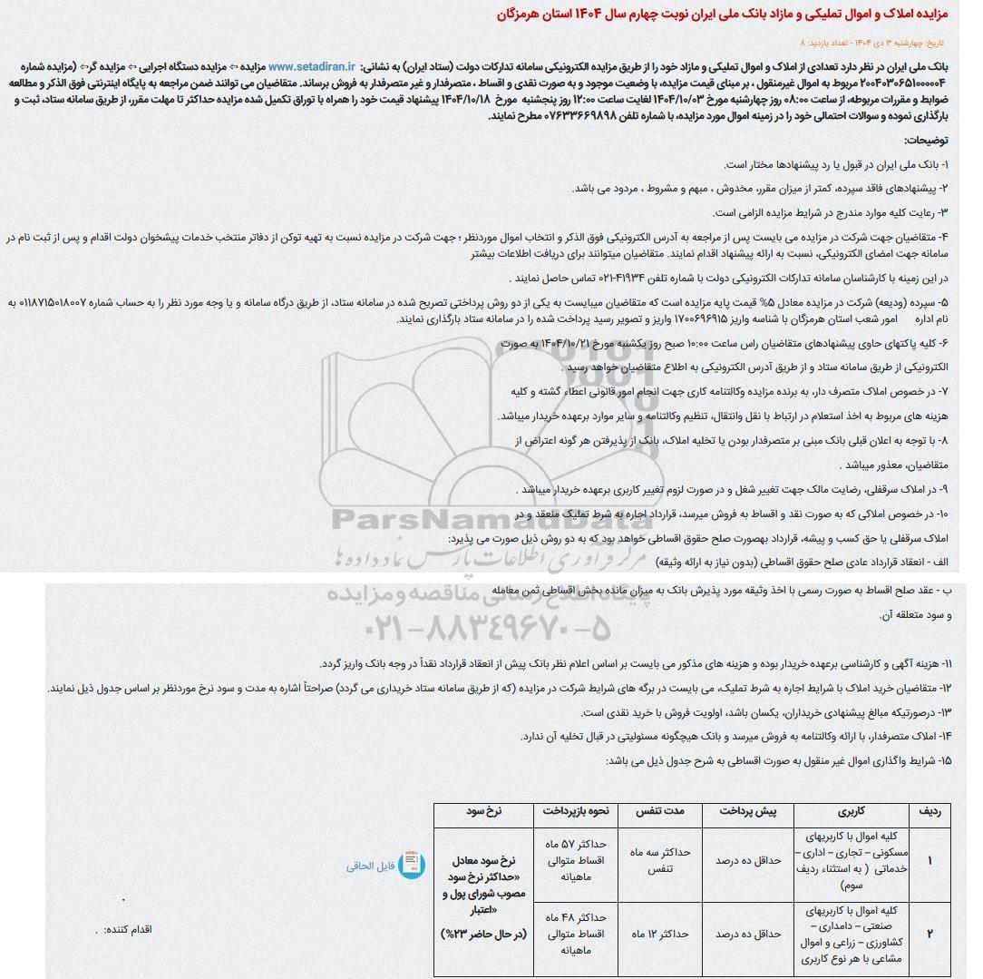 مزایده املاک و اموال تملیکی و مازاد بانک ملی ایران نوبت چهارم سال 1404 استان هرمزگان