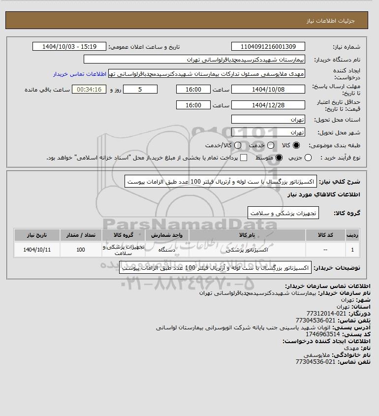 استعلام اکسیژناتور بزرگسال با ست لوله و آرتریال فیلتر 100 عدد طبق الزامات پیوست, استعلام اکسیژناتور بزرگسال با ست لوله و آرتریال فیلتر 100 عدد طبق الزامات پیوست