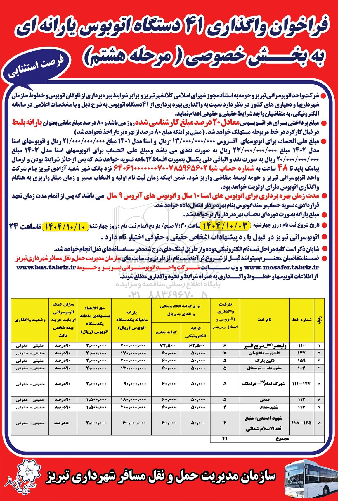 شرکت واحد اتوبوسرانی تبریز و حومه به استناد مجوز شورای اسلامی کلانشهر تبریز و برابر ضوابط بهره برداری از ناوگان اتوبوس و خطوط سازمان شهرداریها و دهیاری های کشور در نظر دارد نسبت به واگذاری بهره برداری از 41 دستگاه اتوبوس به شرح ذیل و با مشخصات اعلامی در سامانه الکترونیکی، به متقاضیان واجد شرایط حقیقی و حقوقی اقدام نماید.
