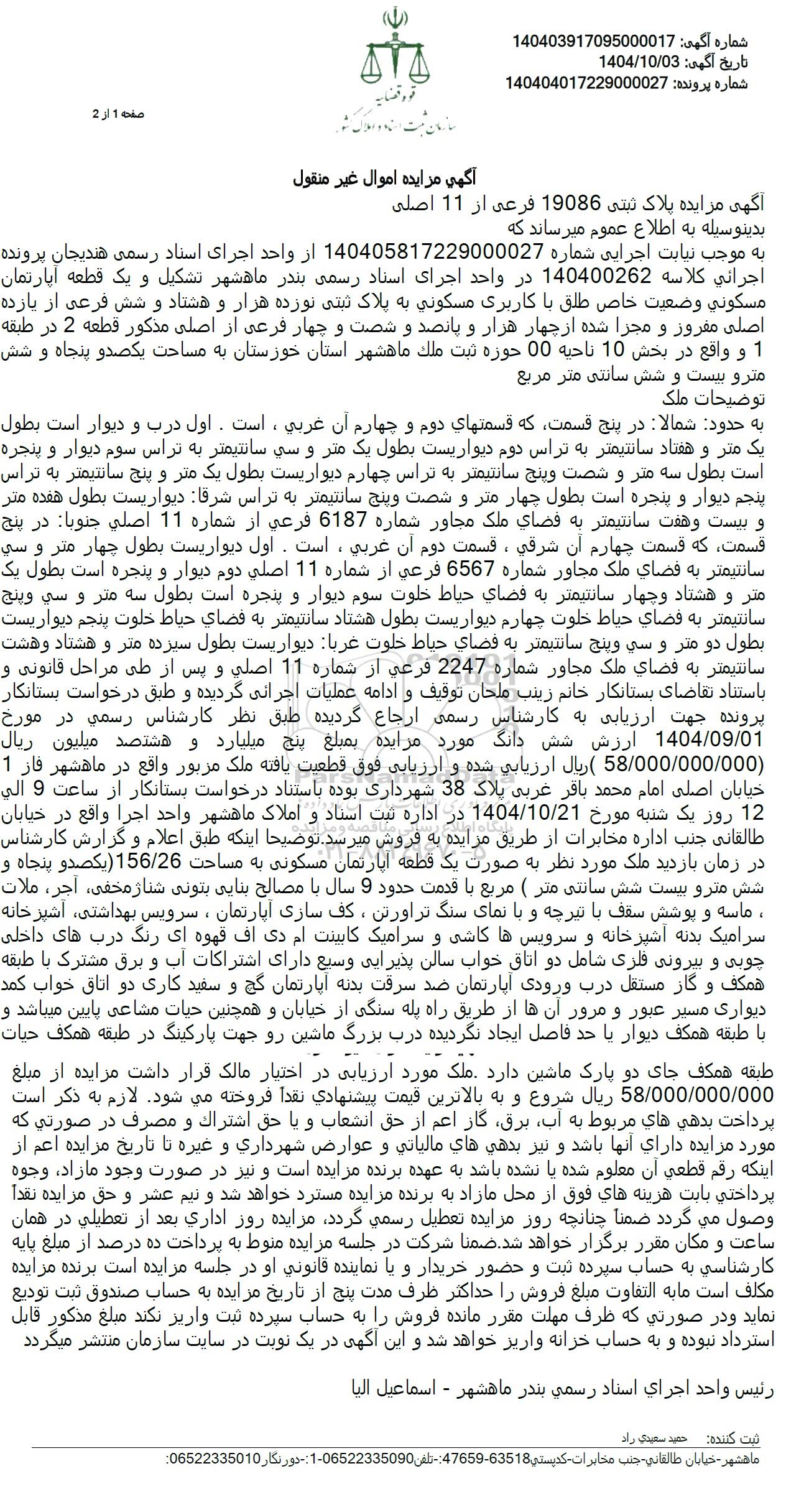 آگهی مزایده پلاک ثبتی 19086 فرعی از 11 اصلی بدینوسیله به اطلاع عموم میرساند کهبه موجب نیابت اجرایی شماره 140405817229000027 از واحد اجرای اسناد رسمی هندیجان پرونده اجرانی کلاسه 140400262 در واحد اجرای اسناد رسمی بندر ماهشهر تشکیل و یک قطعه آپارتمان مسكوني وضعيت خاص طلق با کاربری مسکونی به پلاک ثبتی نوزده هزار و هشتاد و شش فرعی از یازده اصلی مفروز و مجزا شده از چهار هزار و پانصد و شصت و چهار فرعی از اصلی مذکور قطعه 2 در طبقه 1 و واقع در بخش 10 ناحیه 00 حوزه ثبت ملك ماهشهر استان خوزستان به مساحت یکصدو پنجاه و شش مترو بیست و شش سانتی متر مربع توضیحات ملکبه حدود شمالا در پنج قسمت که قسمتهای دوم و چهارم آن غربی است. اول درب و دیوار است بطول یک متر و هفتاد سانتیمتر به تراس دوم دیواریست بطول یک متر و سی سانتیمتر به تراس سوم دیوار و پنجره است بطول سه متر و شصت و پنج سانتیمتر به تراس چهارم دیواریست بطول یک متر و پنج سانتیمتر به تراس پنجم دیوار و پنجره است بطول چهار متر و شصت و پنج سانتیمتر به تراس شرقا دیواریست بطول هفده متر و بیست و هفت سانتیمتر به فضای ملک مجاور شماره 6187 فرعی از شماره 11 اصلي جنوبا در پنج قسمت که قسمت چهارم آن شرقی، قسمت دوم آن غربی است. اول دیواریست بطول چهار متر و سی سانتیمتر به فضای ملک مجاور شماره 6567 فرعی از شماره 11 اصلي دوم دیوار و پنجره است بطول یک متر و هشتاد و چهار سانتیمتر به فضای حیاط خلوت سوم دیوار و پنجره است بطول سه متر و سي وينج سانتیمتر به فضای حیاط خلوت چهارم دیواریست بطول هشتاد سانتیمتر به فضای حیاط خلوت پنجم دیواریست بطول دو متر و سي وينج سانتیمتر به فضای حیاط خلوت غربا دیواریست بطول سیزده متر و هشتاد و هشت سانتیمتر به فضای ملک مجاور شماره 2247 فرعي از شماره 11 اصلي و پس از طی مراحل قانونی و باستناد تقاضای بستانکار خانم زینب ملحان توقیف و ادامه عملیات اجرائی گردیده و طبق درخواست بستانکار پرونده جهت ارزیابی به کارشناس رسمی ارجاع گردیده طبق نظر کارشناس رسمی در مورخ 1404.09.01 ارزش شش دانگ مورد مزایده بمبلغ پنج میلیارد و هشتصد میلیون ریال (58.000.000.000 ) ريال ارزيابي شده و ارزیابی فوق قطعیت یافته ملک مزبور واقع در ماهشهر فاز 1 خیابان اصلی امام محمد باقر غربی پلاک 38 شهرداری بوده باستناد درخواست بستانکار از ساعت 9 الی 12 روز یک شنبه مورخ 1404.10.21 در اداره ثبت اسناد و املاک ماهشهر واحد اجرا واقع در خیابان طالقانی جنب اداره مخابرات از طریق مزایده به فروش میرسد. توضیحا اینکه طبق اعلام و گزارش کارشناس در زمان بازدید ملک مورد نظر به صورت یک قطعه آپارتمان مسکونی به مساحت 156.26 ( یکصدو پنجاه و شش مترو بیست شش سانتی متر ( مربع با قدمت حدود 9 سال با مصالح بنایی بتونی شناز مخفی اجر ملات ماسه و پوشش سقف با تیرچه و با نمای سنگ تراورتن ، کف سازی آپارتمان، سرویس بهداشتی آشپز خانه سرامیک بدنه آشپرخانه و سرویس ها کاشی و سرامیک کابینت ام دی اف قهوه ای رنگ درب های داخلی چوبی و بیرونی فلزی شامل دو اتاق خواب سالن پذیرایی وسیع دارای اشتراکات آب و برق مشترک با طبقه همکف و گاز مستقل درب ورودی آپارتمان ضد سرقت بدنه آپارتمان گچ و سفید کاری دو اتاق خواب کمد دیواری مسیر عبور و مرور آنها از طریق راه پله سنگی از خیابان و همچنین حیات مشاعی پایین میباشد و با طبقه همکف دیوار یا حد فاصل ایجاد نگردیده درب بزرگ ماشین رو جهت پارکینگ در طبقه همکف حیاتطبقه همکف جای دو پارک ماشین دارد ملک مورد ارزیابی در اختیار مالک قرار داشت مزایده از مبلغ 58.000.000.000 ریال شروع و به بالاترین قیمت پیشنهادي نقدا فروخته می شود. لازم به ذکر است پرداخت بدهي هاي مربوط به آب برق گاز اعم از حق انشعاب و یا حق اشتراك و مصرف در صورتی که مورد مزایده دارای آنها باشد و نیز بدهي هاي مالياتي و عوارض شهرداری و غیره تا تاریخ مزایده اعم از اینکه رقم قطعي آن معلوم شده یا نشده باشد به عهده برنده مزایده است و نیز در صورت وجود مازاد وجوه پرداختی بابت هزينه هاي فوق از محل مازاد به برنده مزای