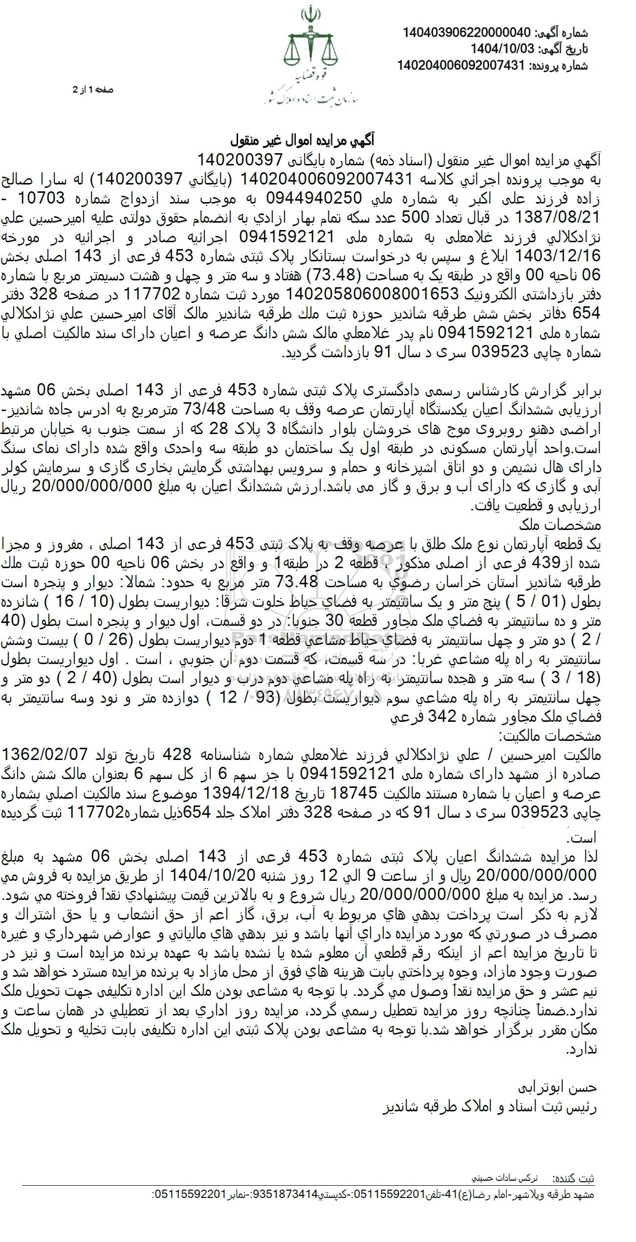 برابر گزارش کارشناس رسمی دادگستری پلاک ثبتی شماره 453 فرعی از 143 اصلی بخش 06 مشهد ارزیابی ششدانگ اعیان یکدستگاه آپارتمان عرصه وقف به مساحت 73.48 متر مربع به ادرس جاده شاندیز اراضی دهنو روبروی موج های خروشان بلوار دانشگاه 3 پلاک 28 که از سمت جنوب به خیابان مرتبط است. واحد آپارتمان مسکونی در طبقه اول یک ساختمان دو طبقه سه واحدی واقع شده دارای نمای سنگ دارای قال نشیمن و دو اتاق اشپزخانه و حمام و سرویس بهداشتی گرمایش بخاری گازی و سرمایش کولر آبی و گازی که دارای آب و برق و گاز می باشد. ارزش ششدانگ اعیان به مبلغ 20.000.000.000 ریال ارزیابی و قطعیت یافت.
